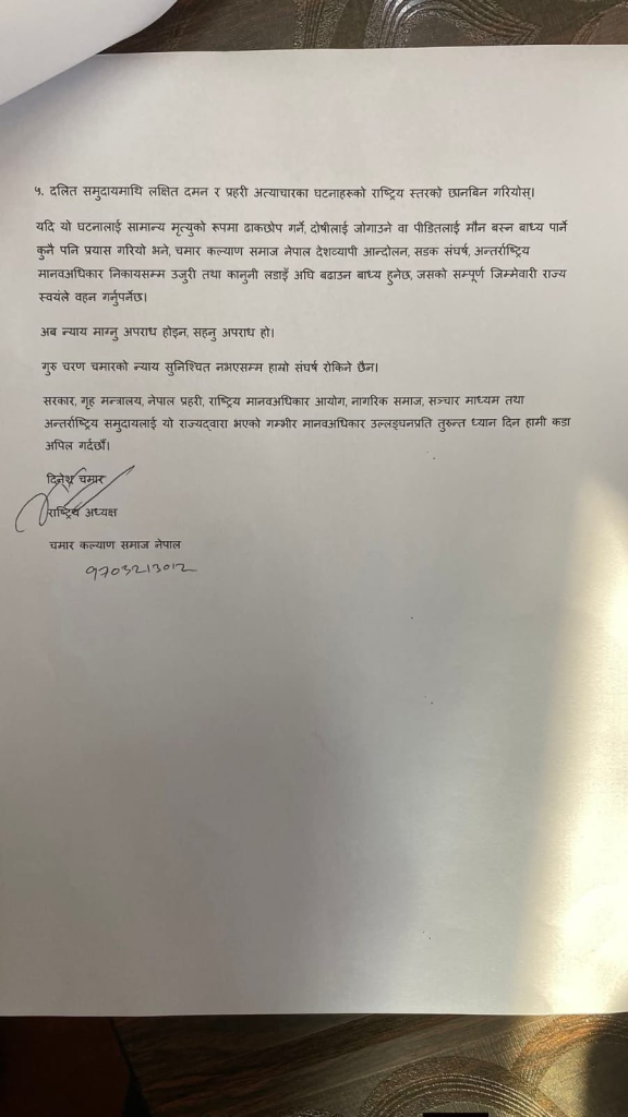 “अब न्याय माग्नु अपराध होइन, सहनु अपराध हो। गुरु चरण चमारको न्याय सुनिश्चित नभएसम्म हाम्रो संघर्ष रोकिने छैन,” विज्ञप्तिमा उल्लेख गरिएको छ।