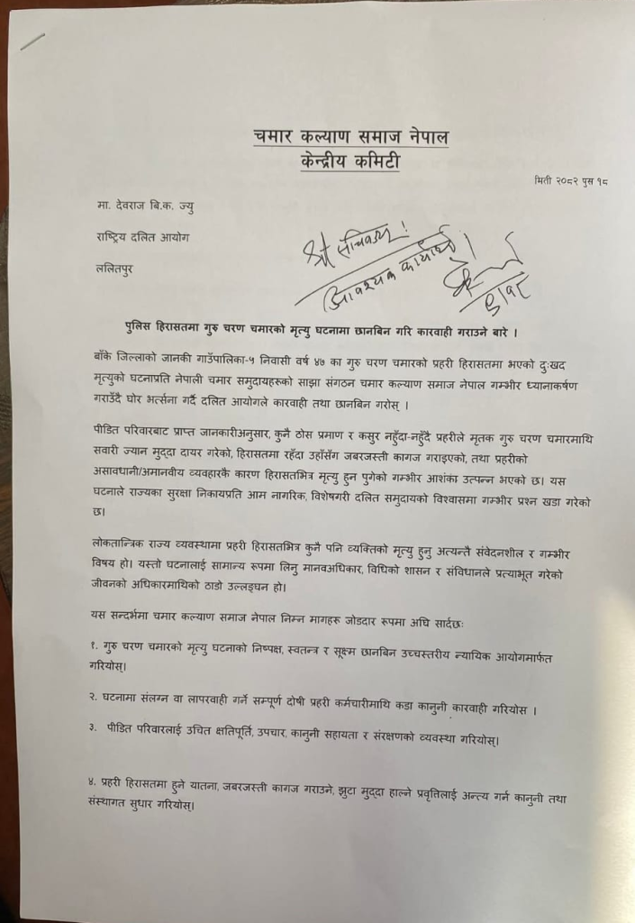 बाँके २० पुष २०८२ । बाँके जिल्लाको जानकी गाउँपालिका–५ निवासी ४७ वर्षीय गुरु चरण चमारको प्रहरी हिरासतमा भएको मृत्यु घटनाप्रति नेपाली चमार समुदायहरूको साझा संगठन चमार कल्याण समाज नेपाल ले गम्भीर ध्यानाकर्षण जनाउँदै घोर भर्त्सना गरेको छ। संगठनले उक्त घटनाको निष्पक्ष छानबिन गरी दोषीमाथि कडा कारवाही गर्न दलित आयोगसहित सम्बन्धित निकायसँग पुष १८ गते ज्ञापनपत्र सहित माग गरेको छ।