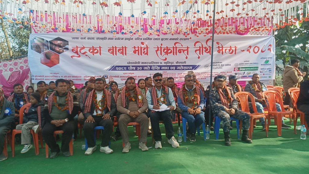 घाेडाघाेडी, माघ १ गते। कैलालीको घोडाघोडी नगरपालिका–७ कृतिपुरस्थित पुरानो धार्मिक स्थल बुट्का बाबा मन्दिरमा माघी सङ्क्रान्ति मेलाको सुरुआत भएको छ। बिहीबार आयोजित कार्यक्रममा नगर प्रमुख खडक बहादुर रावतले मेलाको उद्घाटन गरेका हुन्। भाषा, धर्म, संस्कृति तथा पर्यटन प्रवर्द्धन, पवित्र धार्मिक स्थल बुट्का बाबाको संरक्षण नाराका साथ सुरु भएको मेला चार दिनसम्म चल्नेछ।