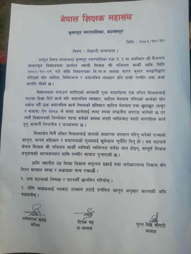 नेपाल शिक्षक महासंघ, कृष्णपुर नगरपालिकाले जारी गरेको विज्ञप्तिअनुसार मिति २०८२/१०/०९ मा सरस्वती पूजा समारोहको अवसरमा विद्यालय व्यवस्थापन समितिका अध्यक्ष सागर कुमार भण्डारीले शिक्षक सार्कीलाई पातमा टिका लगाउन बाध्य बनाएको कार्य अमानवीय, अपमानजनक तथा जातीय विभेदजन्य भएको महासंघले ठहर गरेको छ।