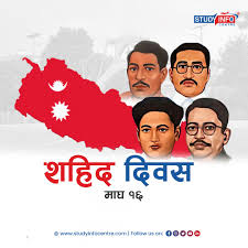 काठमाडौँ, माघ १६ । नेपालमा हरेक वर्ष माघ १६ गते सहिद दिवस मनाइन्छ। निरंकुश राणा शासनविरुद्ध लोकतन्त्र, स्वतन्त्रता र जनअधिकारका लागि प्राण त्याग गरेका वीर सहिदहरूको स्मरण तथा सम्मानस्वरूप यो दिवस मनाउने गरिन्छ।