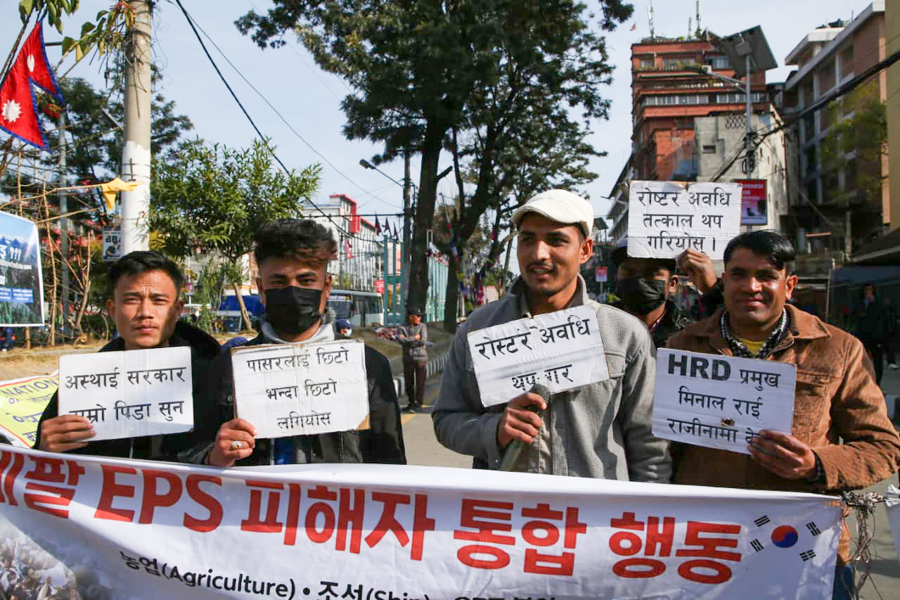 काठमाडौँ । रोजगार अनुमति प्रणाली (ईपिएस) अन्तर्गत दक्षिण कोरिया जानका लागि भाषा परीक्षा उत्तीर्ण गरेका विद्यार्थीहरूले सोमबार काठमाडौँको माइतीघर मण्डलामा विरोध प्रदर्शन गरेका छन्। परीक्षा उत्तीर्ण गरेर पनि लामो समयसम्म कोरिया जाने प्रक्रिया अघि नबढेको र प्रणालीमा पारदर्शीता नभएको भन्दै युवाहरू सडकमा उत्रिएका हुन्। उनीहरुले सोमबार माइतीघरमा विभिन्न नारा लेखेका प्लेकार्ड बोकेर सडकमा उत्रिएका हुन् ।