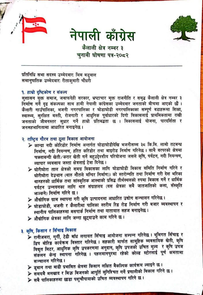 काठमाडौँ । नेपाली कांग्रेसका प्रतिनिधि सभा उम्मेदवार भिम बडुवालले मंगलबार पत्रकार सम्मेलनमार्फत आफ्नो घोषणापत्र सार्वजनिक गरेका छन्। उनले राष्ट्रिय गौरवका परियोजना, कृषि र किसान विकास, सडक तथा पूर्वाधार, शिक्षा, स्वास्थ्य, जल तथा बाढी नियन्त्रण, पर्यटन, युवा रोजगारी, महिला र पिछडिएका समुदायको सशक्तिकरण लगायतका विषयमा योजनाहरू प्रस्तुत गरेका छन्।