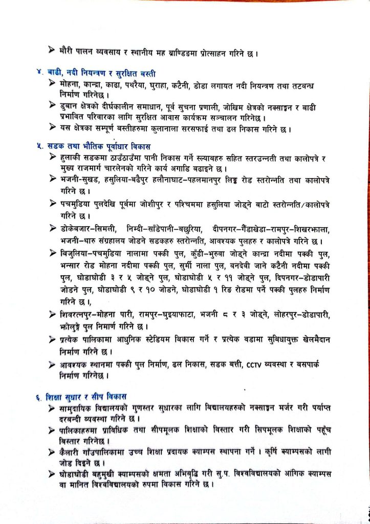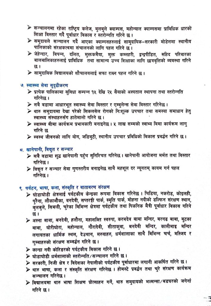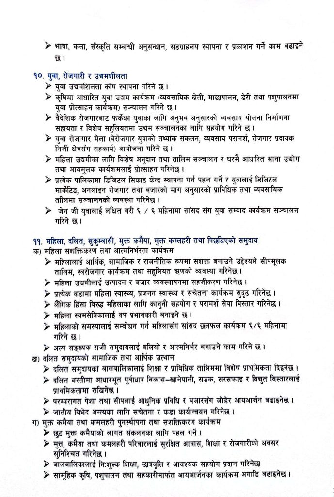 स्वास्थ्य सेवामा सुधारका लागि पालिकास्तरीय अस्पताल, आधारभूत स्वास्थ्य सेवा र स्वास्थ्य बीमा कार्यक्रम विस्तार गरिनेछ भने खानेपानी, विद्युत र सञ्चार सेवामा गुणस्तर सुधार र पहुँच सुनिश्चित गरिने छ। युवाको रोजगारी र उद्यमशीलताका लागि विशेष कोष र तालिम कार्यक्रम सञ्चालन गरिनेछ। महिला, दलित, सुकुम्बासी, मुक्त कमैया, मुक्त कम्लहरी र अन्य पिछडिएका समुदायका लागि सामाजिक र आर्थिक सशक्तिकरण योजनाहरू पनि घोषणापत्रमा समावेश छन्।