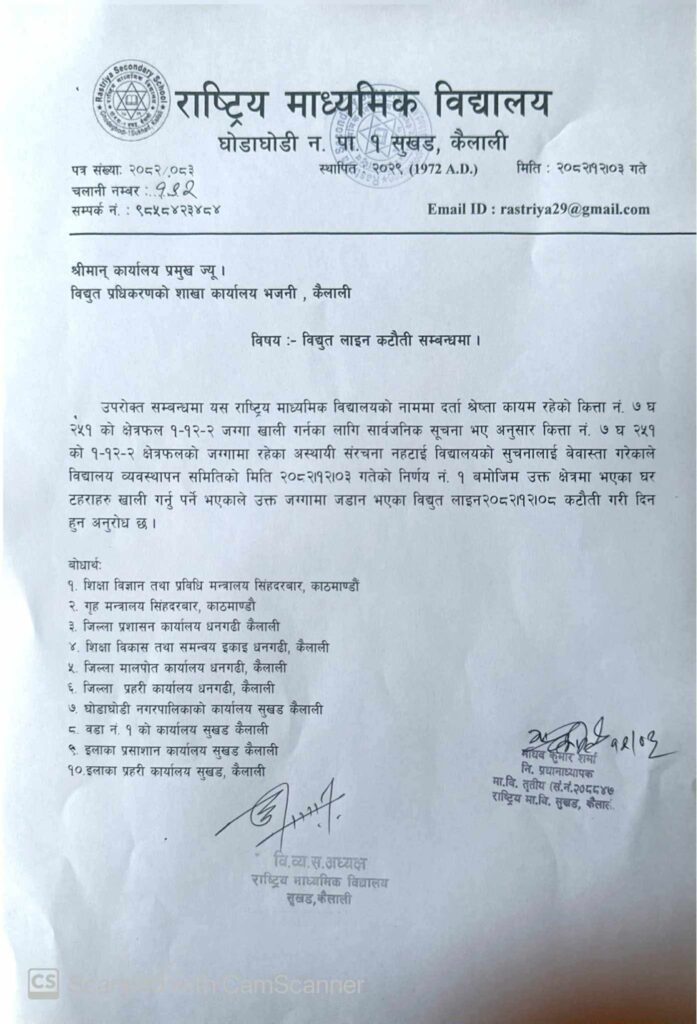 यसै सन्दर्भमा विद्यालय व्यवस्थापन समितिको मिति २०८२ चैत ३ गते बसेको बैठकको निर्णय नं. १ बमोजिम, उक्त क्षेत्रका घर–टहराहरू खाली गराउन थप प्रक्रिया अघि बढाइएको हो। विद्यालयले २०८२ चैत ८ गतेभित्र उक्त जग्गामा जडान गरिएका विद्युत लाइन काट्नका लागि नेपाल विद्युत प्राधिकरण शाखा कार्यालय भजनी, कैलालीलाई सार्वजनिक पत्राचार गरि अनुरोध गरेको जनाएको छ।