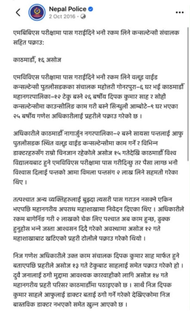 अनुसन्धानका क्रममा उनले आफूलाई डाक्टर बताउँदै ठगी गर्ने गरेको खुलेको थियो भने उनी वास्तविक चिकित्सक नभएको पनि पुष्टि भएको प्रहरीले जनाएको थियो।
